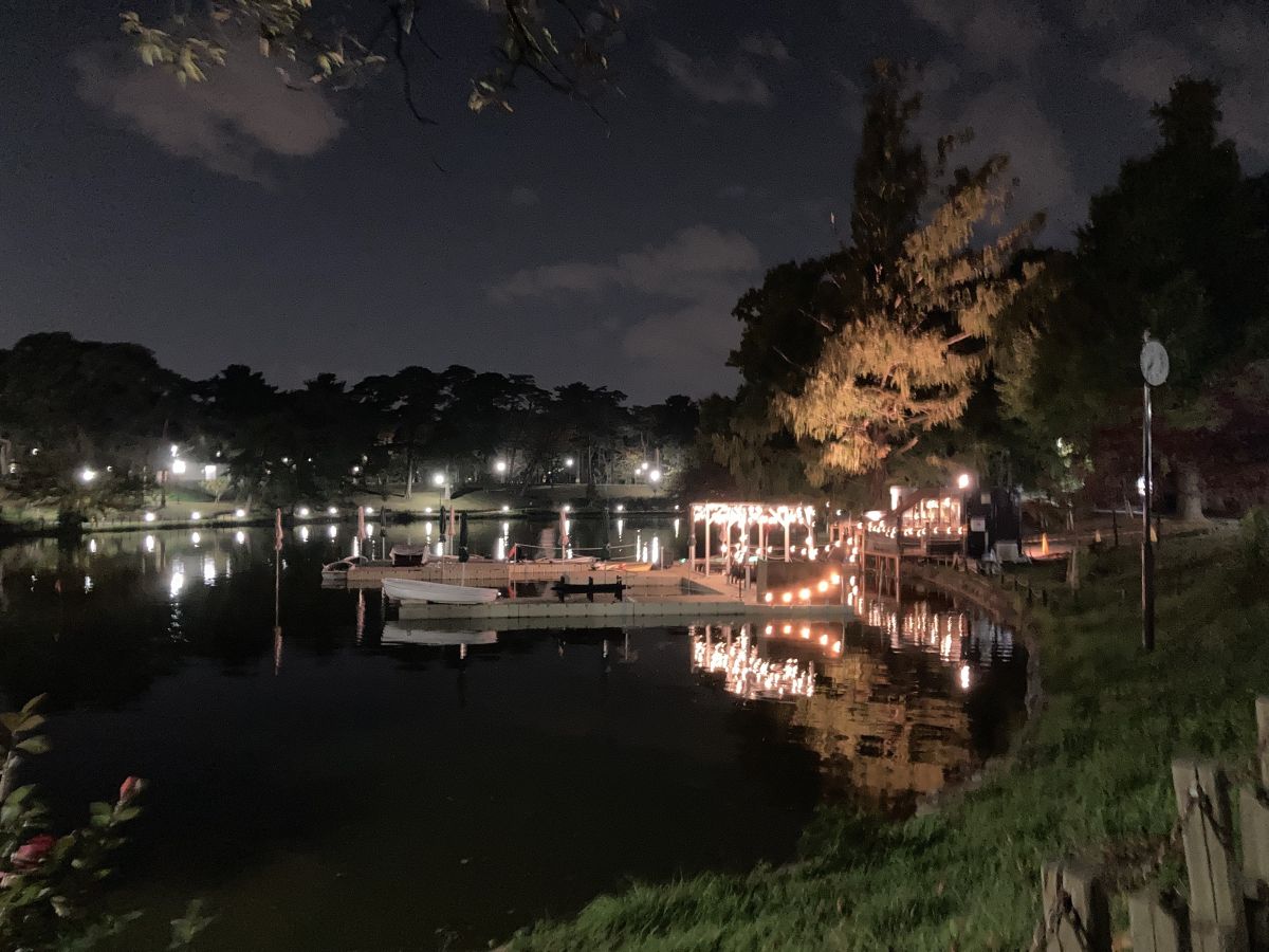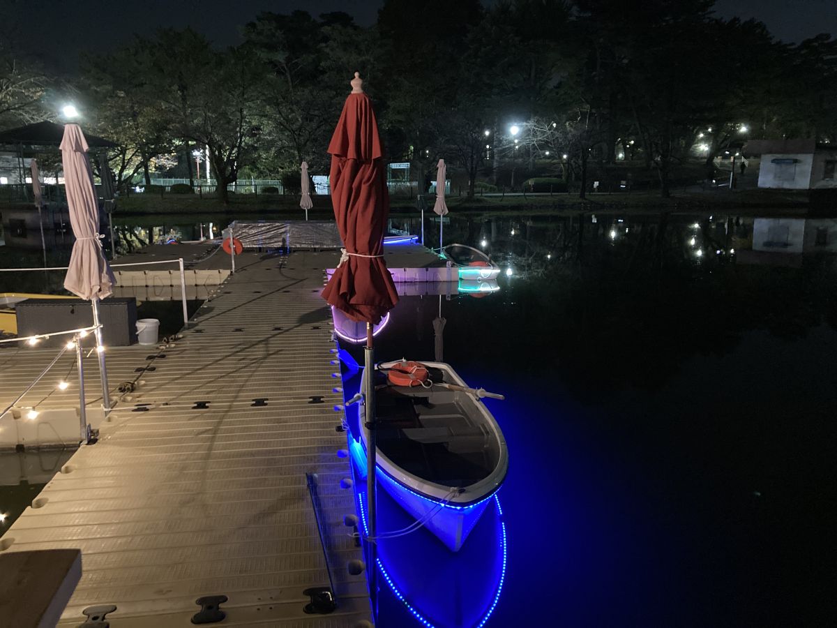 日が暮れたら、ハーバーテラスやボートがライトアップされるナイトタイム営業へ。水面にハーバーのネオンが照らされ、幻想的な雰囲気を釀します。池へとこぎ出せば、夜空を独り占めしたような贅沢な気分に。ボートの光が周囲の水を透過して、池の中まで見えるのもこの時間ならでは。また、ゴイサギのように夜にしか活動しない鳥に出会えることもあるのだとか。