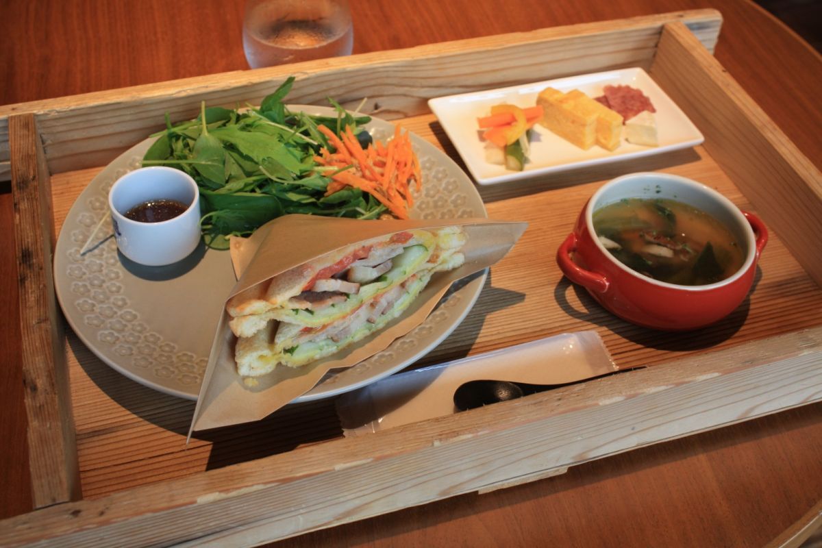 自家製ベーコンがサンドされたホットサンドに、だし巻き卵やピクルスがセットになっており、ソフトドリンクにも日本酒にも合うセットになっています。