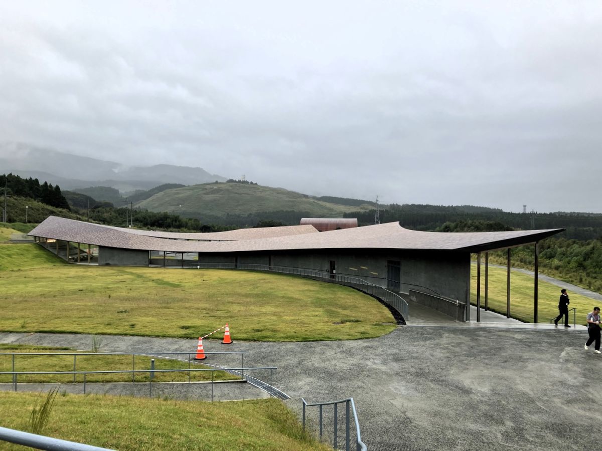 阿蘇の広大な自然に抱かれるように立つモダンな建物は、2023年にオープンした「熊本地震 震災ミュージアム KIOKU」です。2016年4月に発生した熊本地震の被災の様子や、震災から得られた教訓を後世に伝えるための展示がされています。