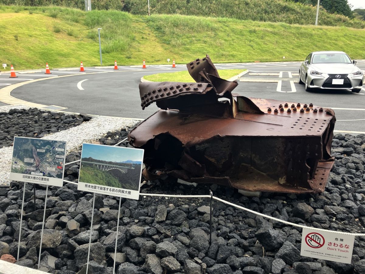 車を降りてまず目に入ったのが、この鉄の塊。 地震で崩落した阿蘇大橋の鉄骨が展示されています。元の形を留めていないほどに変形してしまった鉄骨を見て、地震の威力を感じずにはいられません。