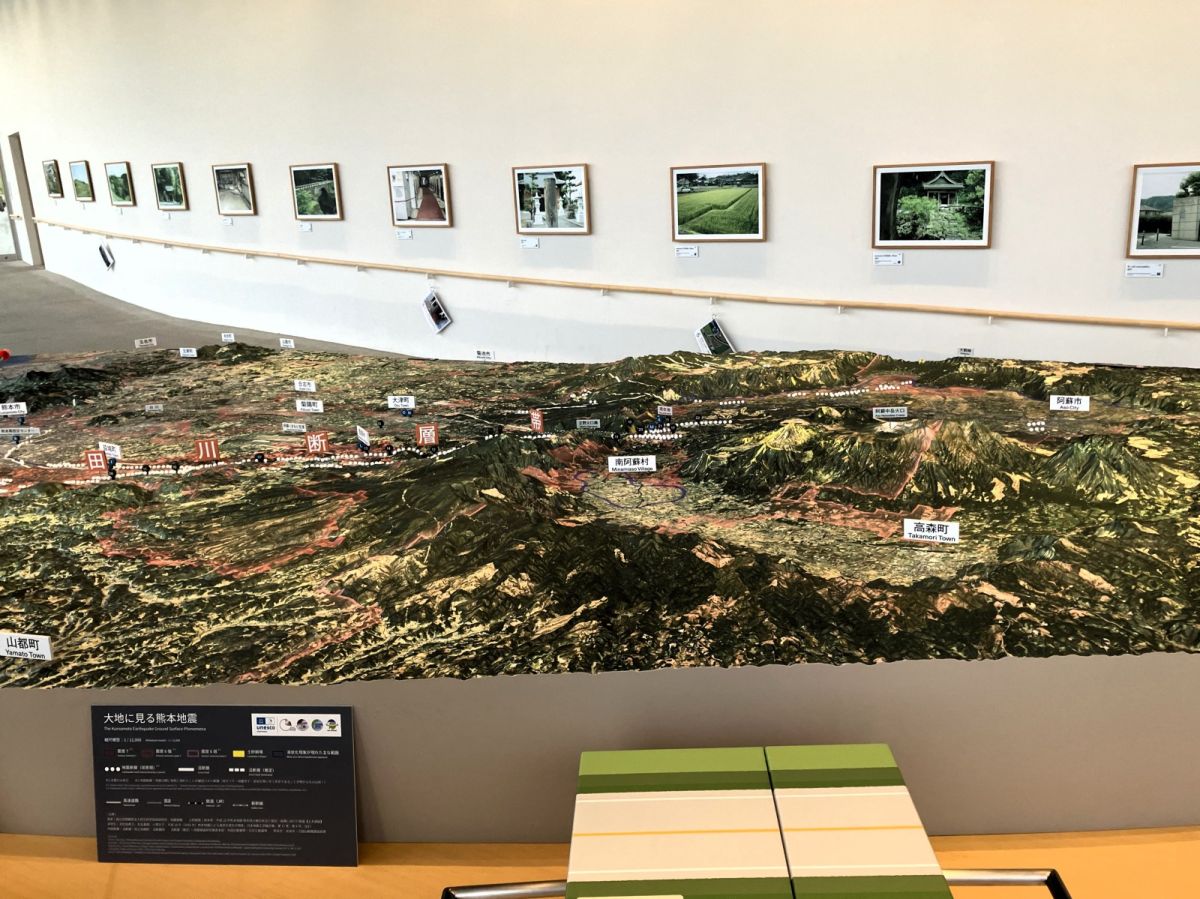 館内には地震発生時や地震後の様子を映像で伝えるシアターや、南阿蘇村周辺のジオラマの展示などがあり、地震の恐ろしさを伝えるだけでなく、自然との共生や復興までの歩み、いつ起こるか分からない震災への備えなど、さまざまな形で紹介しています。