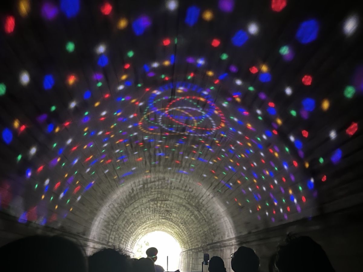 高千穂鉄橋までは約2.5km。途中、トンネルを何カ所か通りますが、トンネル内を見上げるとプラネタリウムのようなカラフルな電飾で楽しませてくれます。緑が生い茂る線路を通って、どんどん進んでいきます。