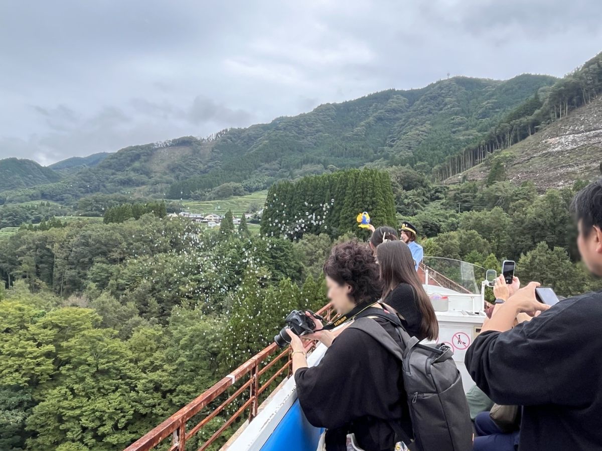 運転士さんが高千穂や高千穂あまてらす鉄道のガイドをしながら、シャボン玉を飛ばしていました。高千穂の絶景に無数のシャボン玉が舞い、ここだけでしか見られない幻想的な風景を存分に堪能し、高千穂駅に戻って30分の絶景旅は終了です。