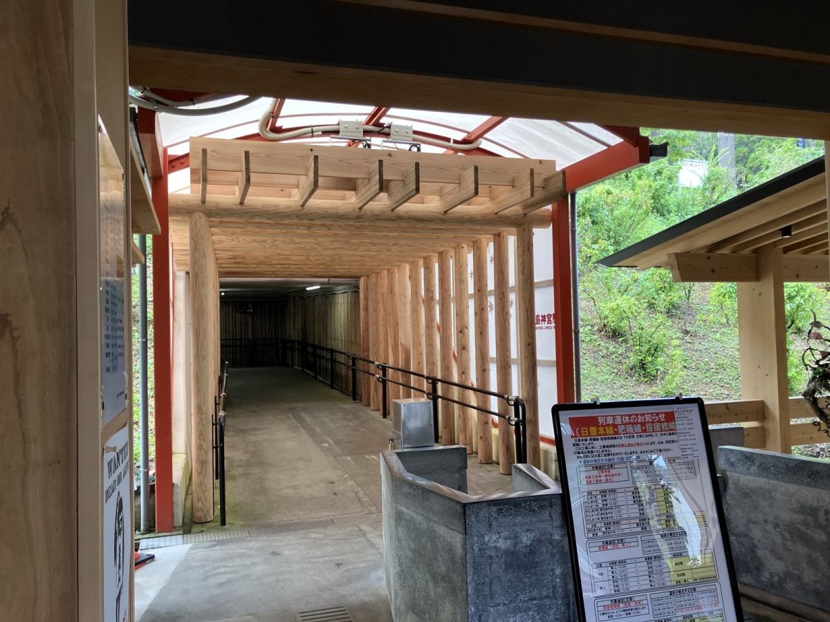 改札の中にはいくつもの鳥居が連なり、霧島神宮の入口としてのムードを演出。鳥居や駅舎には、鹿児島県産の杉が使われており、天然の杉の香りが駅舎を包み込んでいます。