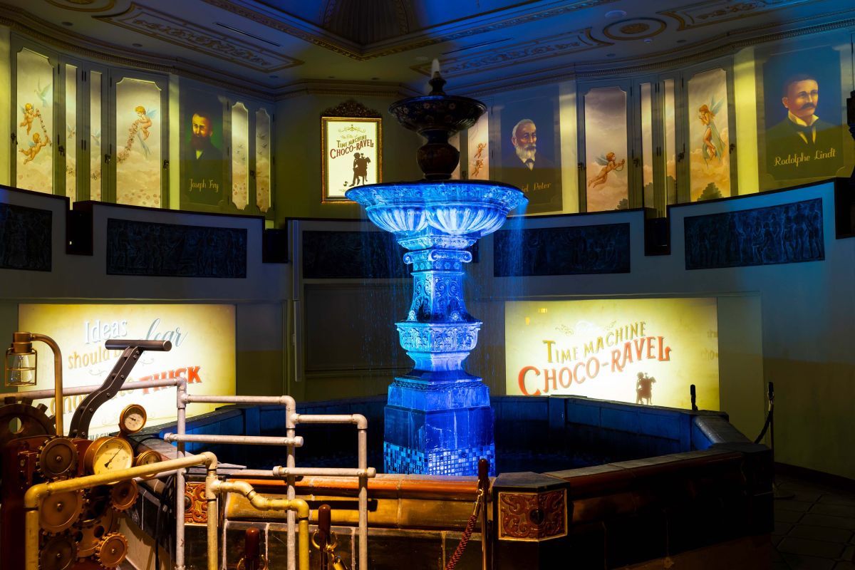 有料エリアの階段を上り見学ゾーンへと進んでいくと、そこはまるでお城の中のような別世界…。プロジェクションマッピングが投影されるショーでは、映像と音声で、チョコレートの歴史を楽しく学ぶことができます。