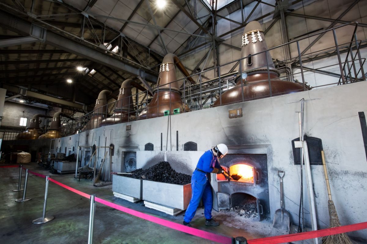 こちらがもろみを加熱してアルコール分を抽出する蒸溜棟で、並んでいる釜がポットスチルです。「ニッカウヰスキー北海道工場 余市蒸溜所」の一番の特徴は、「石炭直火蒸溜」。温度調整は難しいのですが、直火を使い800~1200℃で蒸溜することで、香ばしく力強い味わいのウイスキーができるのだそう。