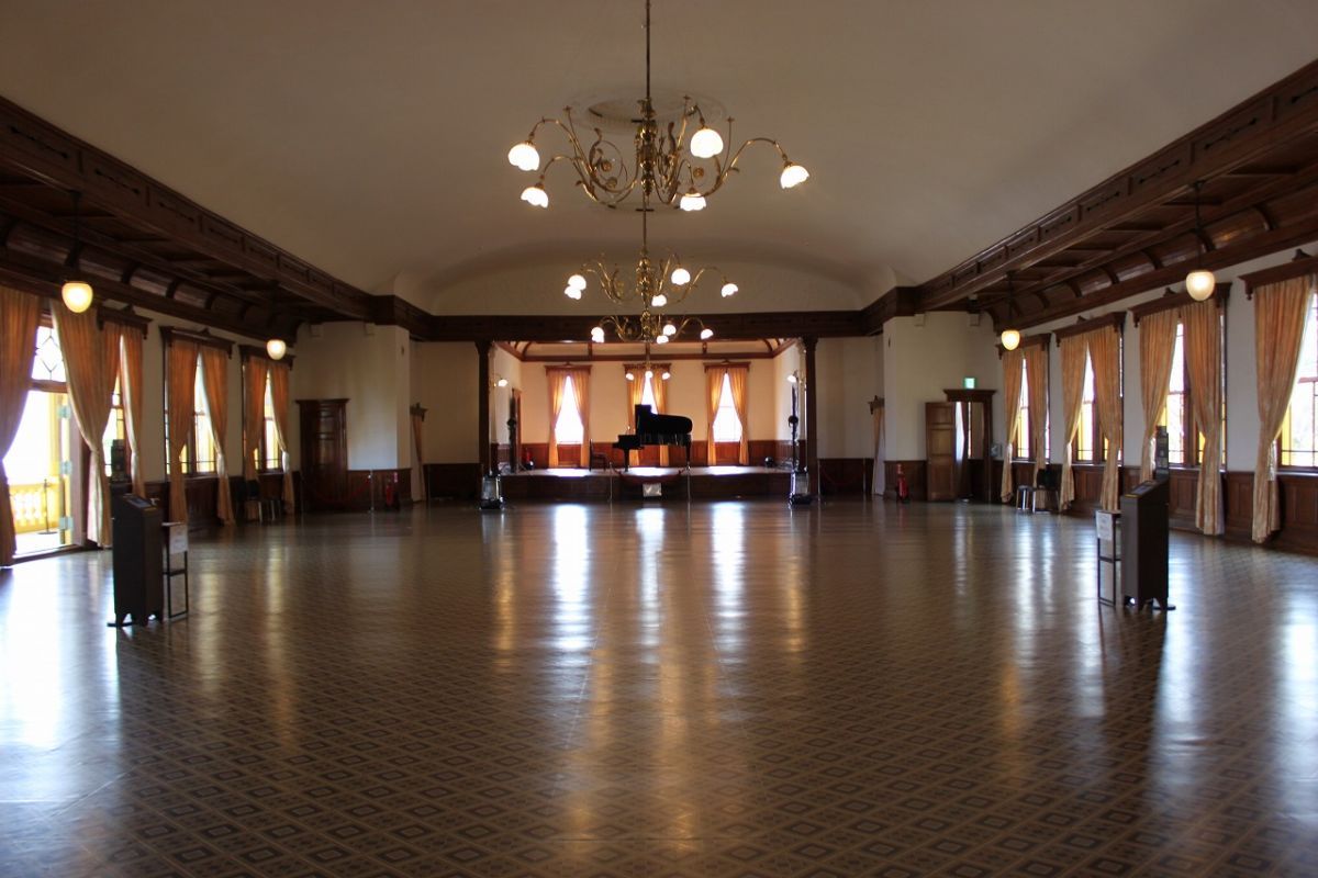 バルコニーへと連なる大広間も圧巻です。130坪、高さ約6mの大広間は、函館区民の集会所として音楽会や講演会等の行事に使用されてきました。現在も貸室として利用できるほかコンサートなども開催されるので、公式ホームページをチェックしてみてくださいね。