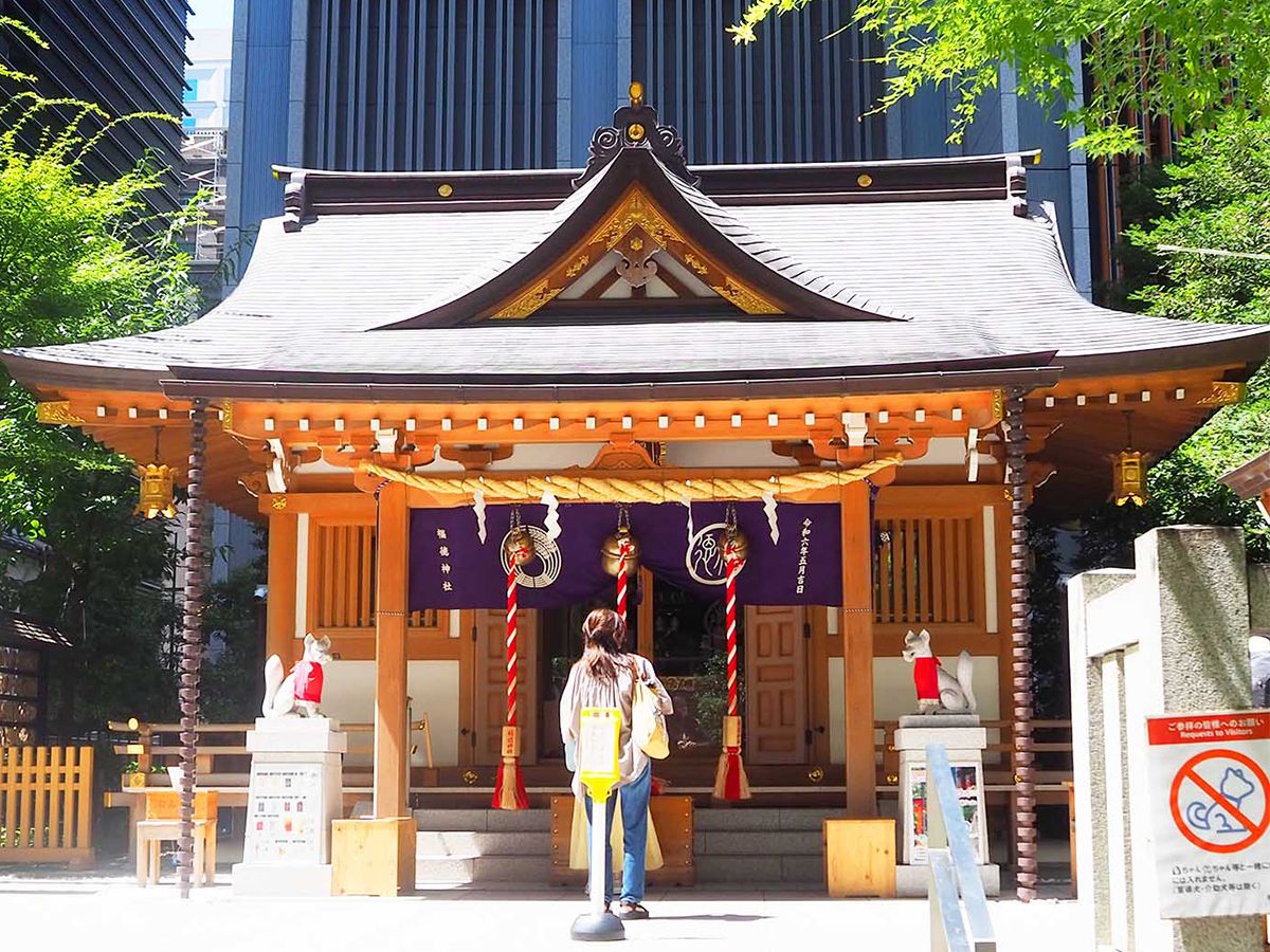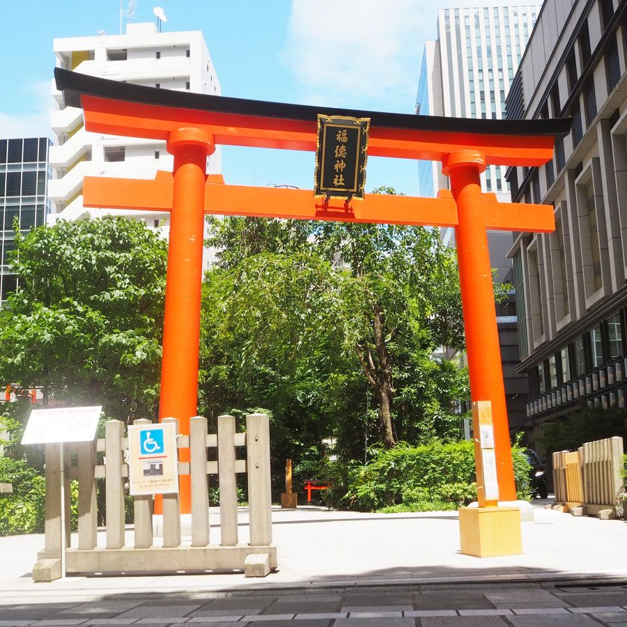 東京メトロ・三越前駅A6出口から徒歩約1分。都会のビル群の中に忽然とあらわれる朱色の鳥居が目をひく「福徳神社」。