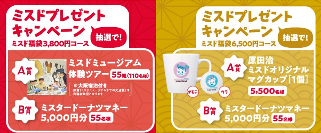 福袋に入っている「ドーナツ引換カード」が応募券となり、アプリ応募から「ミスドミュージアム体験ツアー」やキャンペーン限定のオリジナルデザインの「原田治オリジナルマグカップ」が抽選でプレゼントされます。