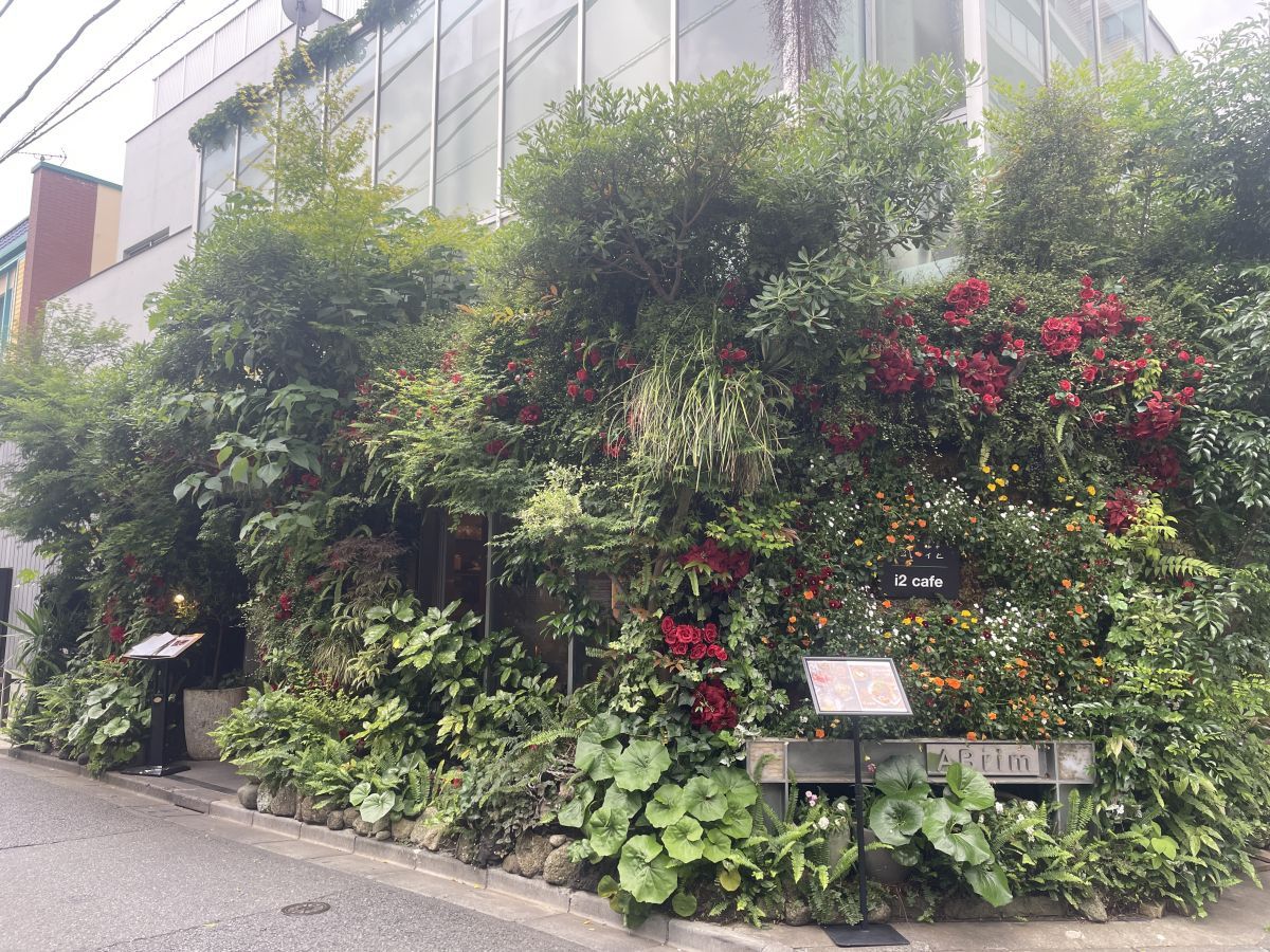 東京メトロ表参道駅A4出口から徒歩約5分。大通りから一歩路地へ入ると、花とグリーンに囲まれた「i2 cafe(あいつー かふぇ)」が見えてきます。そのたたずまいは、まるで森の中にある隠れ家のよう!