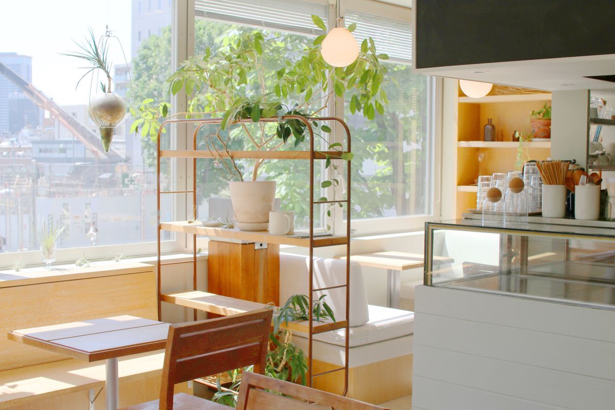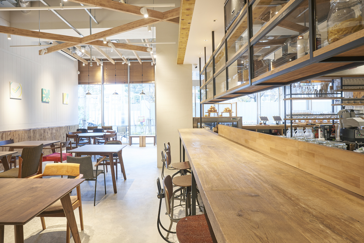 店内は木を貴重としたシンプルな造り。広々としたテーブル席と1人でもくつろげるカウンター席があり、老若男女問わずさまざまな方の癒やしスポットに。外のテラス席も人気で、お散歩やショッピングの途中に気軽に寄れるのもうれしい!