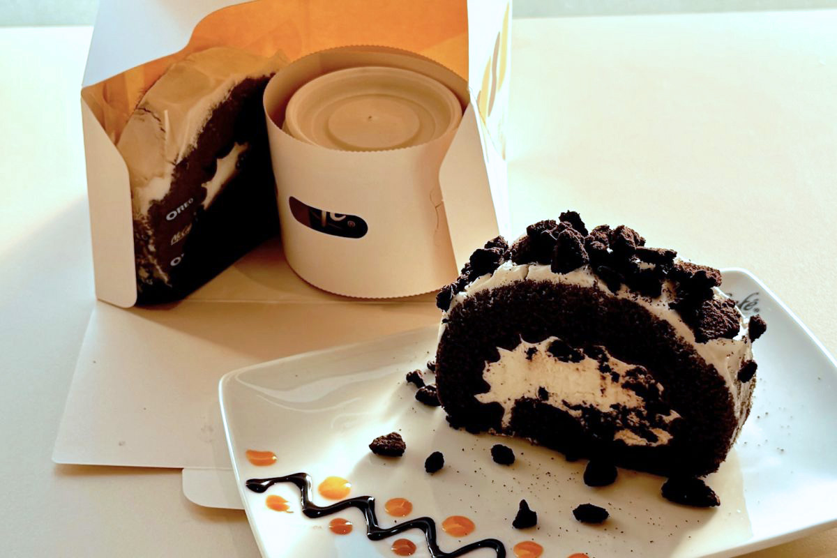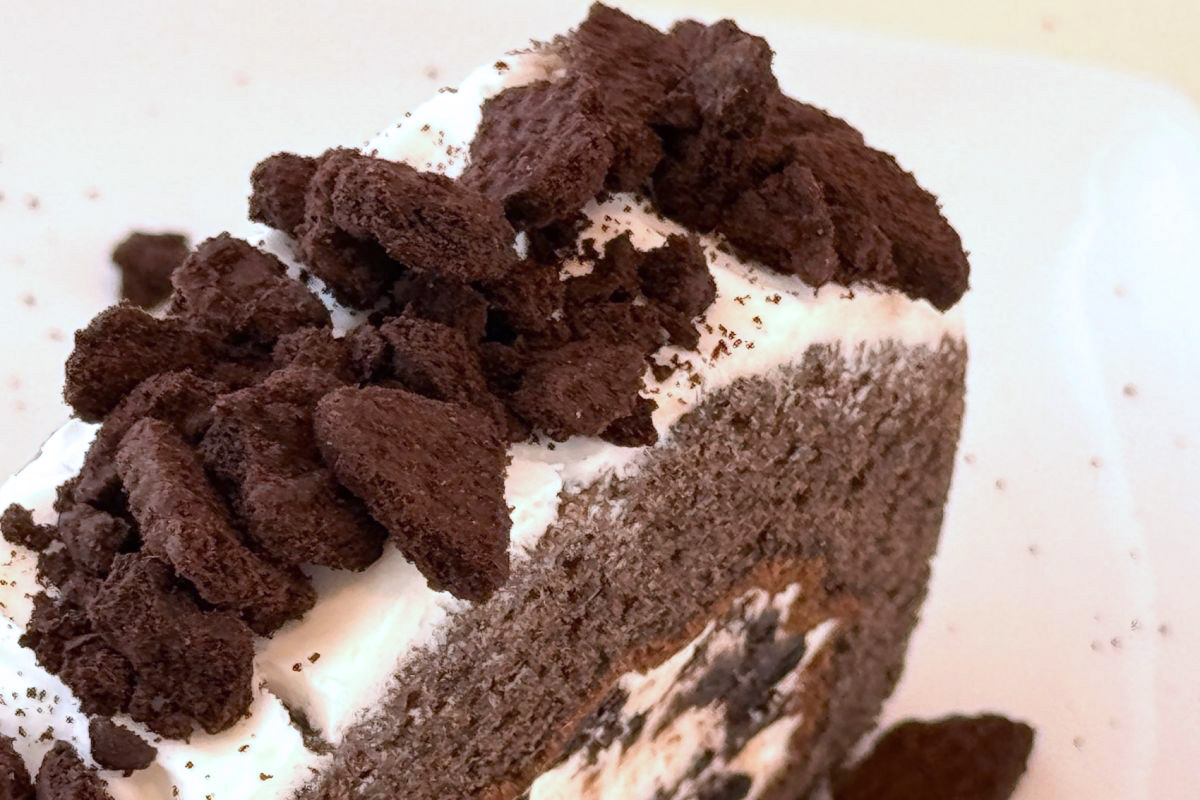 ココア味のスポンジに、ココアクッキーを混ぜ込んだ口どけなめらかなクリームを包んだロールケーキ。その上にオレオ®クッキーがトッピングされています。