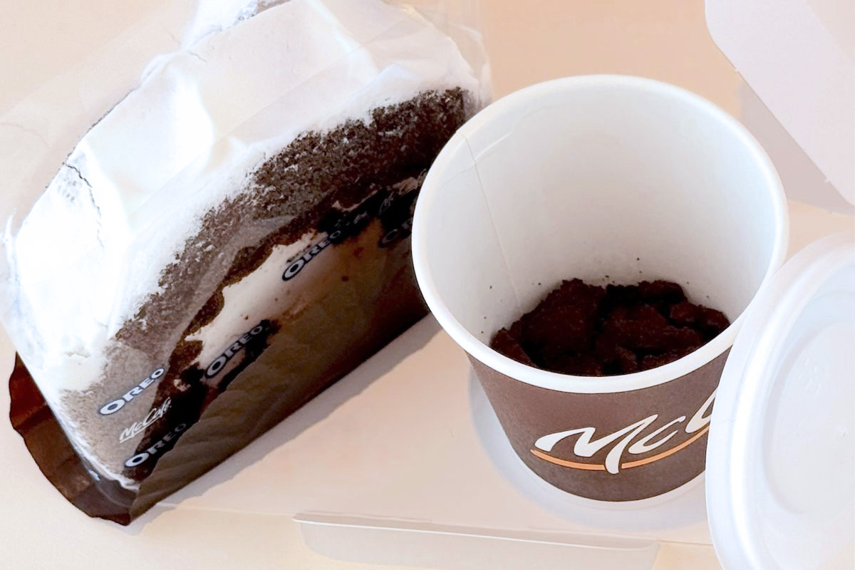 デリバリーで届いたら、カップの中からオレオ®クッキーを取り出して、ロールケーキにトッピングしましょう。お店で食べるのと同じ状態で、味わえますよ。