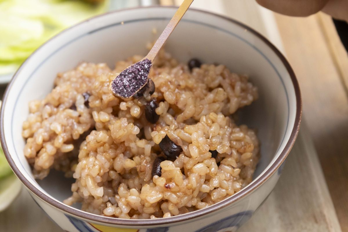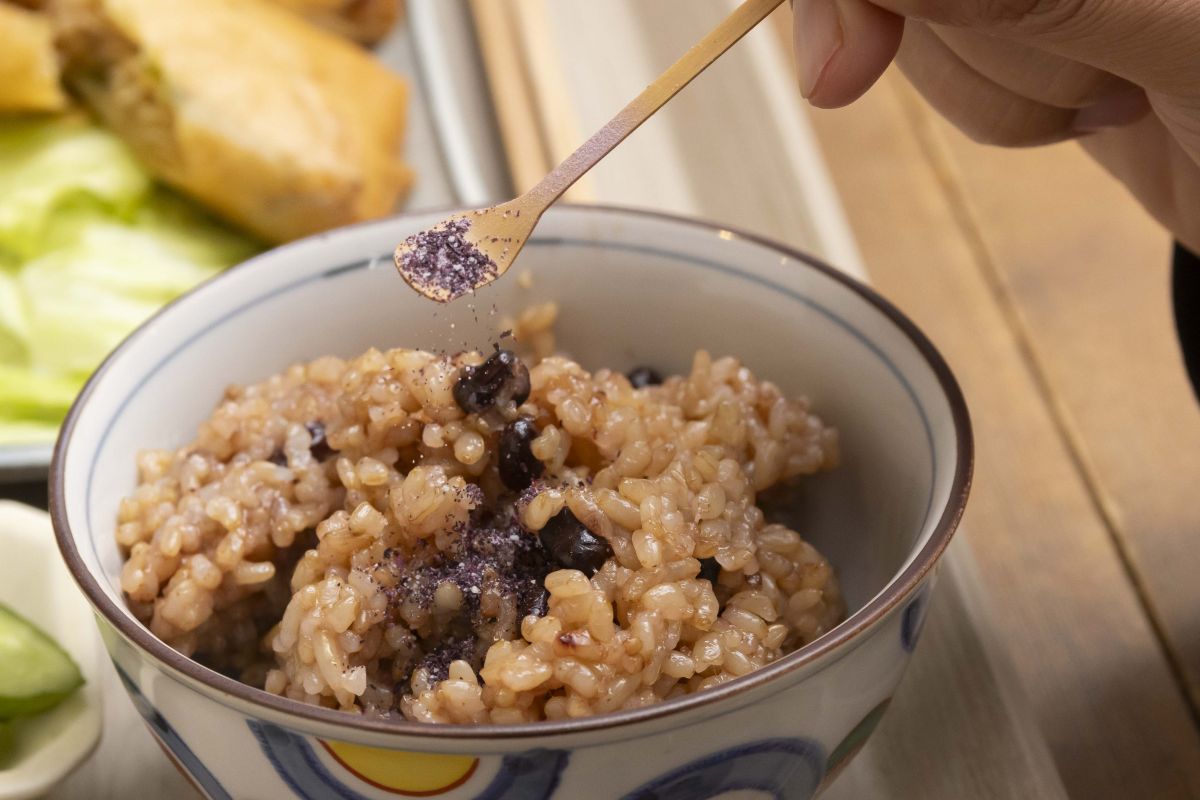 「寝かせ玄米®」は小豆を加えて炊き上げることで、甘みや旨みのほかに香ばしさも加わり、それだけで十分美味しく楽しめますが、しそふりかけや黒ゴマ塩をかけるとより一層玄米の甘みを楽しむことができます。
