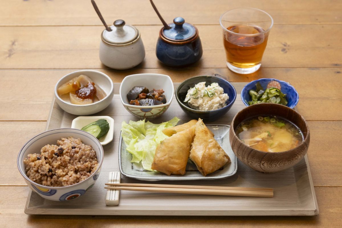 11時30分からはランチメニューが始まります。定番は「あおい定食」1600円で、主菜のほか小鉢が4種、「寝かせ玄米®」のご飯に味噌汁、お漬物がつきます。主菜は週に2回内容が変わり、たとえば月~水曜は春巻き、木~土曜は豚肉の生姜焼きと、ご飯がすすむボリューム満点の内容となっています。ご飯は大盛がプラス100円、おかわりがプラス150円で注文できるので、男性でもお腹いっぱい楽しめますよ。