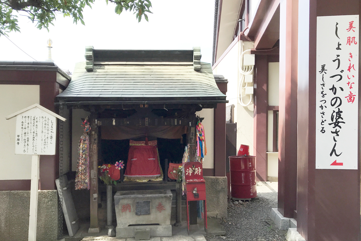 西解脱門の近くにある「しょうづかの婆さん」は、美人祈願の隠れ参拝スポットです。 “しょうづかの婆さん”とは、三途の川で亡者の衣服をはぎ取る奪衣婆(だつえば)のことで、葬頭河の婆(そうづかのば)ともいわれます。それが訛って“しょうづかの婆さん”とよばれるようになったそうです。 昔から歯の痛みを癒し、心身を美しくすると信じられていて、日本中からここを訪れる女性が多いとか。 ピンク色が可愛い「しょうづかべっぴん守」500円は、境内にあるお守り授け所で授与されているので、美のご利益が欲しい人は立ち寄ってみて下さいね!