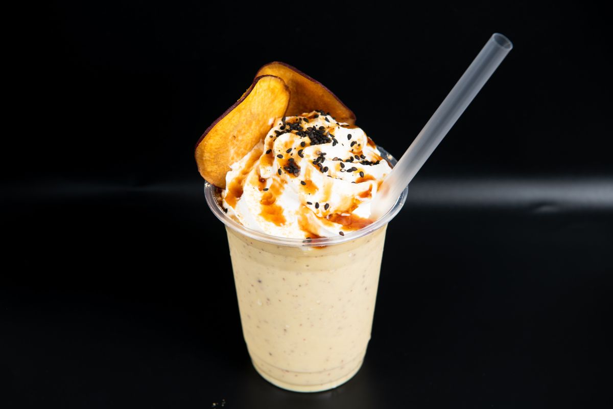 お客さんの5人に1人が注文する、焼き芋を皮付きのまま丸ごと使った「焼き芋シェイク」680円は、飲むスイートポテトのような濃厚な味わい。