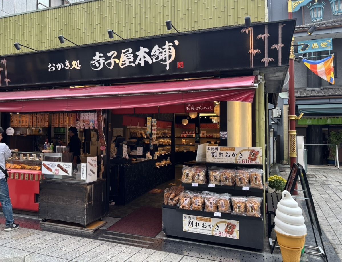 参道に広がる香ばしい匂いを辿ると、もち焼きせんべい専門店の「寺子屋本舗」が。店頭には20種類近くの作りたておかきやぬれ煎餅が並んでいて、定番の「醤油せんべい」190円をはじめ、川崎大師店限定の「串ぬれおかきにんにく」300円や「串ぬれおかき一味にんにく」300円などの変わり種まで、悩んでしまうラインナップに!