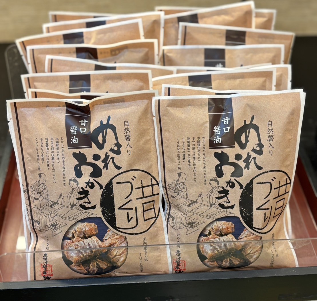 おみやげには、自然薯が入ったもちもちの「ぬれおかき」540円がおすすめ。定番の甘口醤油味はほんのり甘く、昔ながらのやさしい砂糖醤油風味。本醸造醤油味や七味味もあって、食べる手が止まりません。