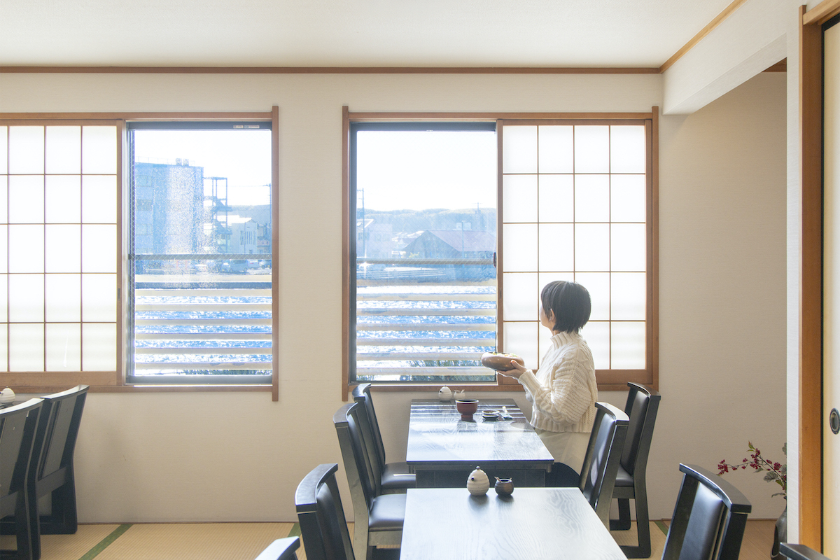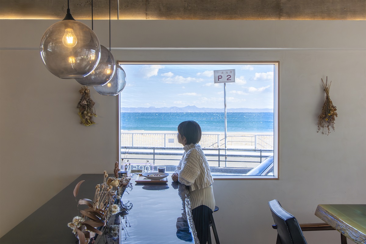 店内の窓から見える青い空と海、砂浜は、まるでアートパネルのよう。設計は一級建築士でもあるオーナーが手がけていて、窓枠を額縁のように見立て、ロケーションを最大限に生かした空間になっています。