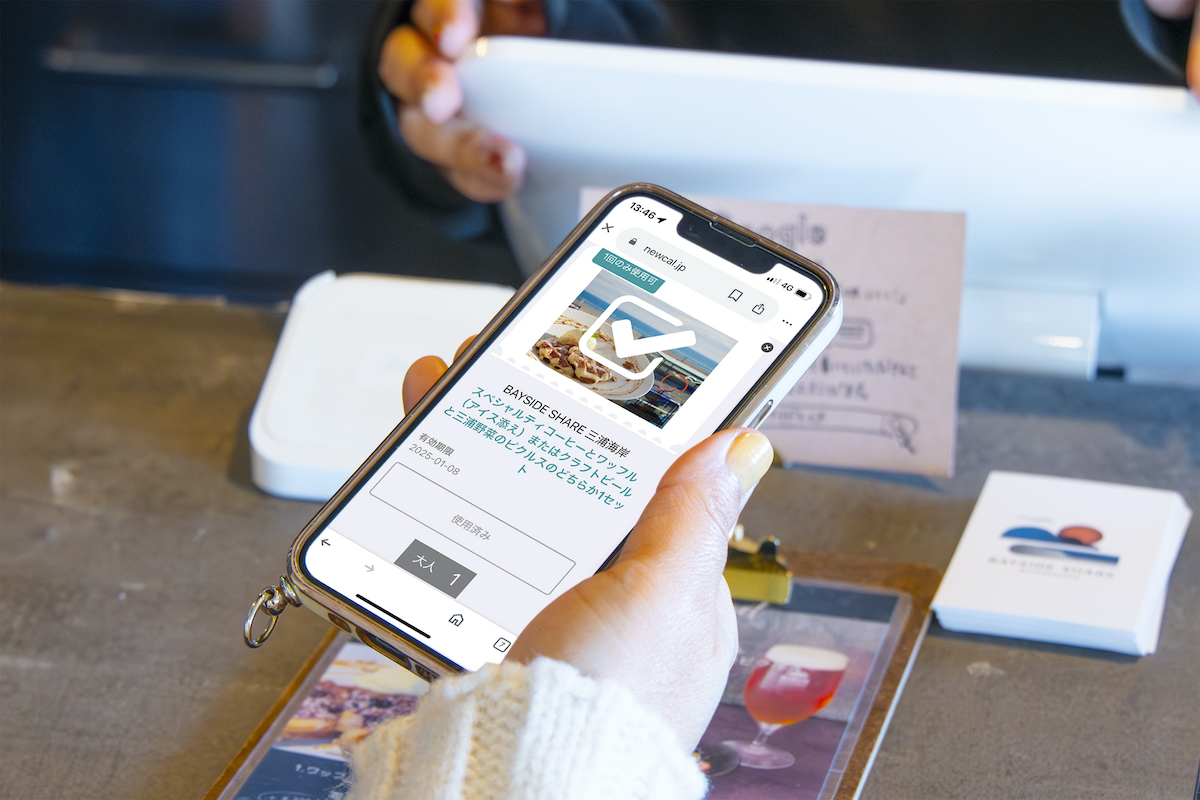 三浦・三崎のお楽しみはまぐろだけではありません。次は「三浦・三崎おもひで券」を活用して、カフェでのんびりしましょう。「まぐろまんぷく券」も「三浦・三崎おもひで券」も、加盟店できっぷ用メニューをオーダーし、デジタルきっぷの場合は会計時に一覧画面から該当店舗・利用人数を選択してスマホ画面を提示します。磁気乗車券の場合は、券をスタッフに渡せばOKです。
