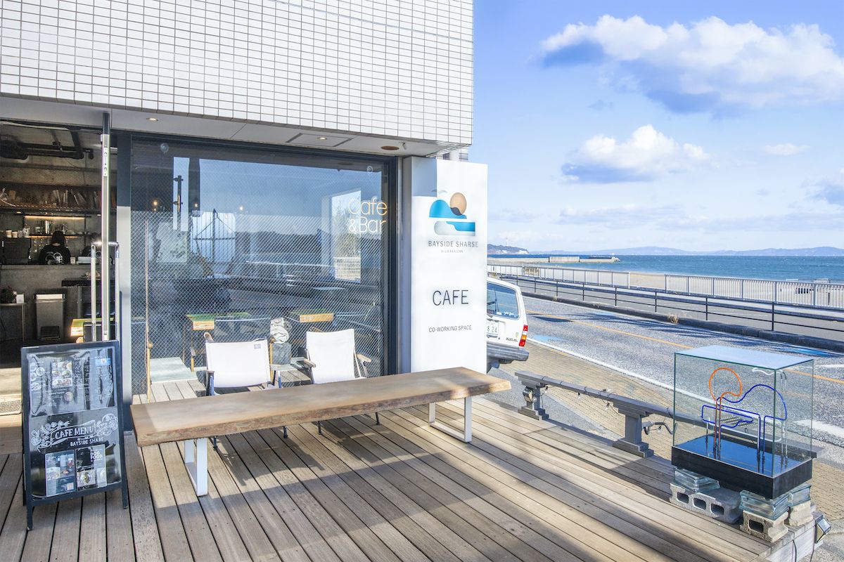 国道134号線をはさんで、すぐ目の前に下浦海岸が広がる「BAYSIDE SHARE 三浦海岸」。漁協組合の事務所だった建物をリノベーションして、カフェ兼コワーキングスペースとして、2021年にオープンしました。