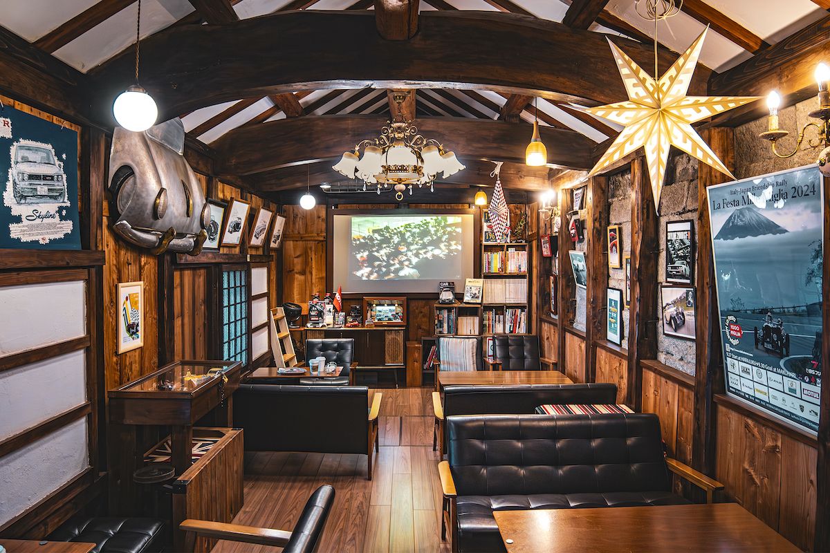 蔵の2階はクルマ関連のアンティークグッズが配され、落ち着いてお茶できる空間。元は金物屋さんの蔵だったそうで、カーブが見事な赤松の梁はそのまま残されています。