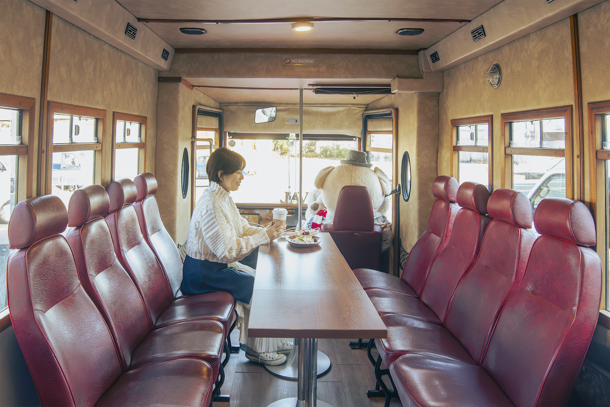 テラス席の隣には「フォード」の赤いボンネットバスが停まっていて、車内は客席になっています。個室空間なので、5名以上やファミリーを優先的にご案内しているそう。