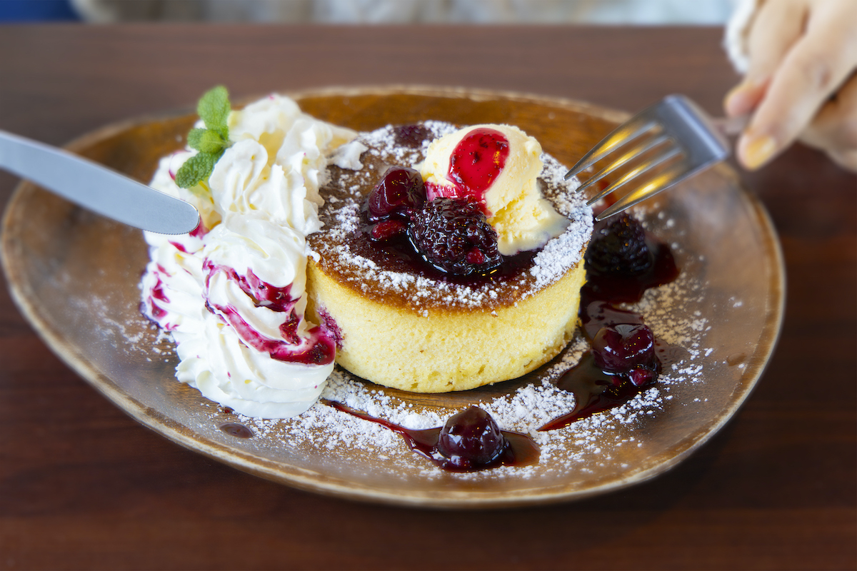 「三浦・三崎おもひで券」で提供されるメニューは「本日のパンケーキ」、もしくは「コーヒーゼリーオレ」&オリジナルグッズ。取材日はスフレタイプのふわふわパンケーキに、ミックスベリーのソース、バニラアイス、さらに盛り盛りのホイップクリームが添えられていました。