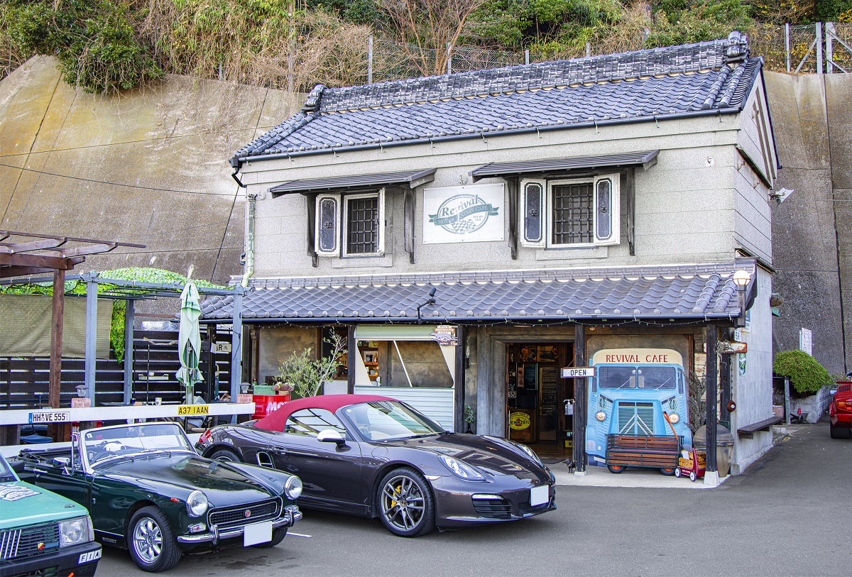 「Revival CAFE」は古くてもいいものを残したい、クルマ好きが集まれる場所を作りたいと、築100年の蔵を再生して2018年にオープンしたお店です。駐車場に並ぶヴィンテージカーやクラシックカー、スポーツカーは訪れる方のもの。テラス席で愛車を眺め、エンジン音や旧車特有のノスタルジックな香りに包まれながら、クルマ談義に花を咲かせています。