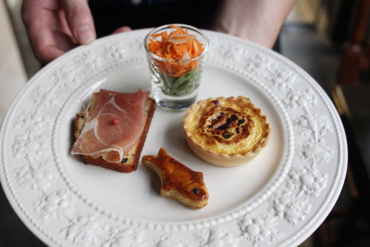 アフタヌーンティーセットには東京や福岡、パリ、ノルマンディの名店で修業をしたオーナーシェフの岩崎さんが、腕によりをかけた本格セイボリーやスイーツがラインナップ。下から1段目には、「ケーク・サレ&生ハム」「キャロットラペ」、かわいい魚の形をした「アンチョビパイ」のほか、「奈良県産野菜のキッシュ」も並んでいます。