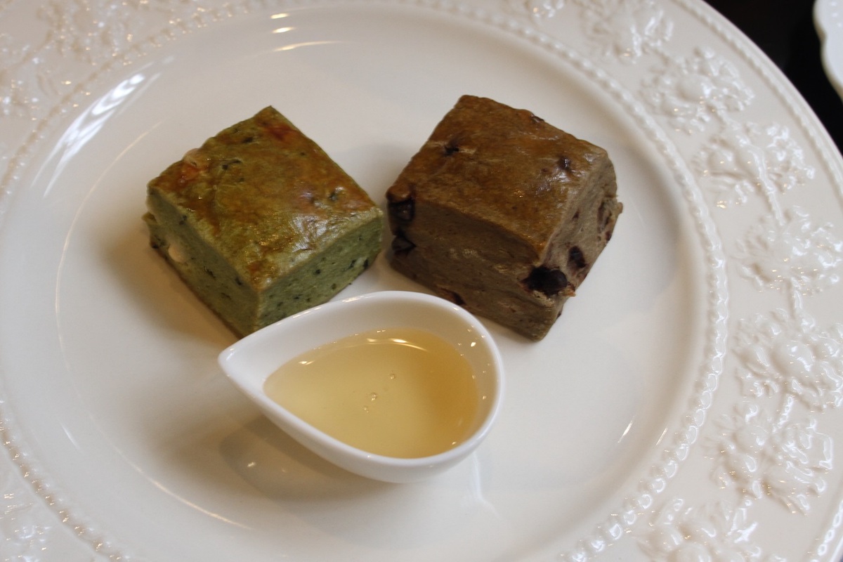 2段目には奈良県産の「大和茶のスコーン」1個と「大和ほうじ茶のスコーン」1個、奈良県産はつみつが並びます。スコーンの中には、お茶の風味を活かすためにチョコレートが入っているのが特徴。大和茶にはホワイトチョコ入り。ほんのり苦みのあるお茶の味にチョコレートの甘さが重なり、紅茶のお供にもぴったりの一品です。奈良のはちみつをたっぷりつけて、ぜひじっくり味わってみて。