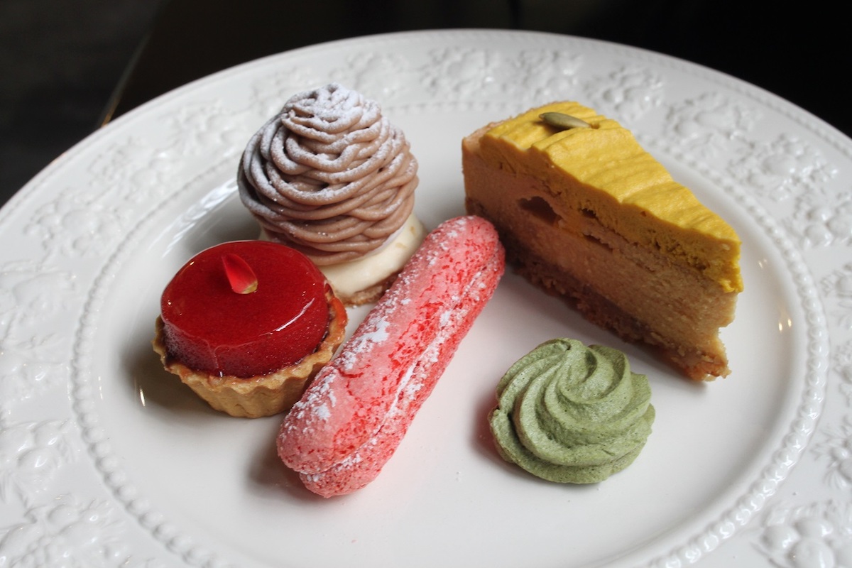 一番上には、見た目も華やかな5種類のスイーツがずらり。濃厚なカボチャの風味が感じられる「パンプキンキャラメルのタルト」をはじめ、「モンブラン」「苺と薔薇のタルトショコラ」「ビスキュイシャンパーニュ」「抹茶メレンゲ」といった一口サイズのかわいいスイーツがいただけます。