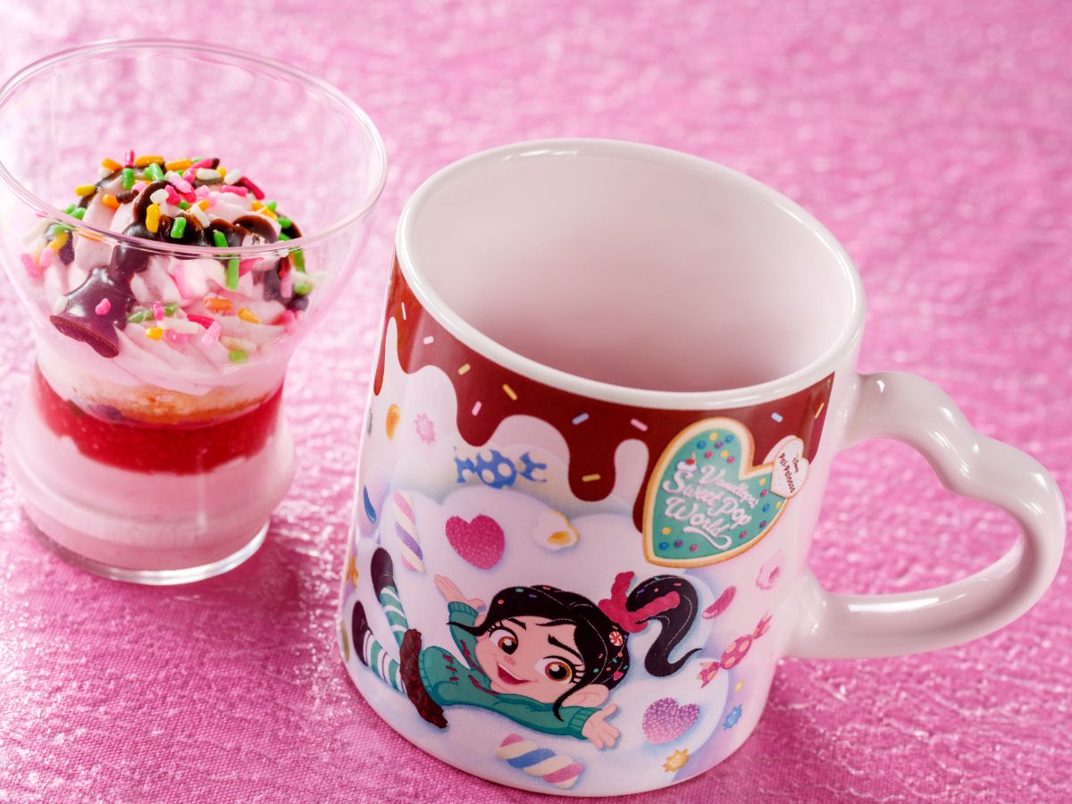 ストロベリーいっぱいのスウィーツ。カラフルなチョコスプレーが見た目にも食感にも、楽しいアクセントに。スーベニアカップはヴァネロペと、ミッキーたちが描かれています。持ち手がハート型なのもかわいい!