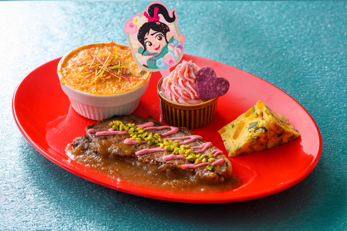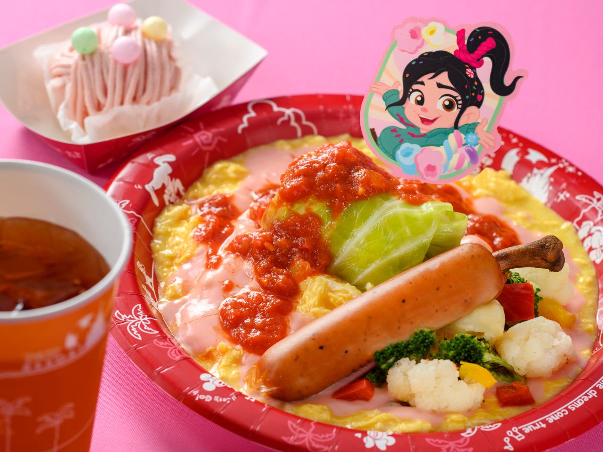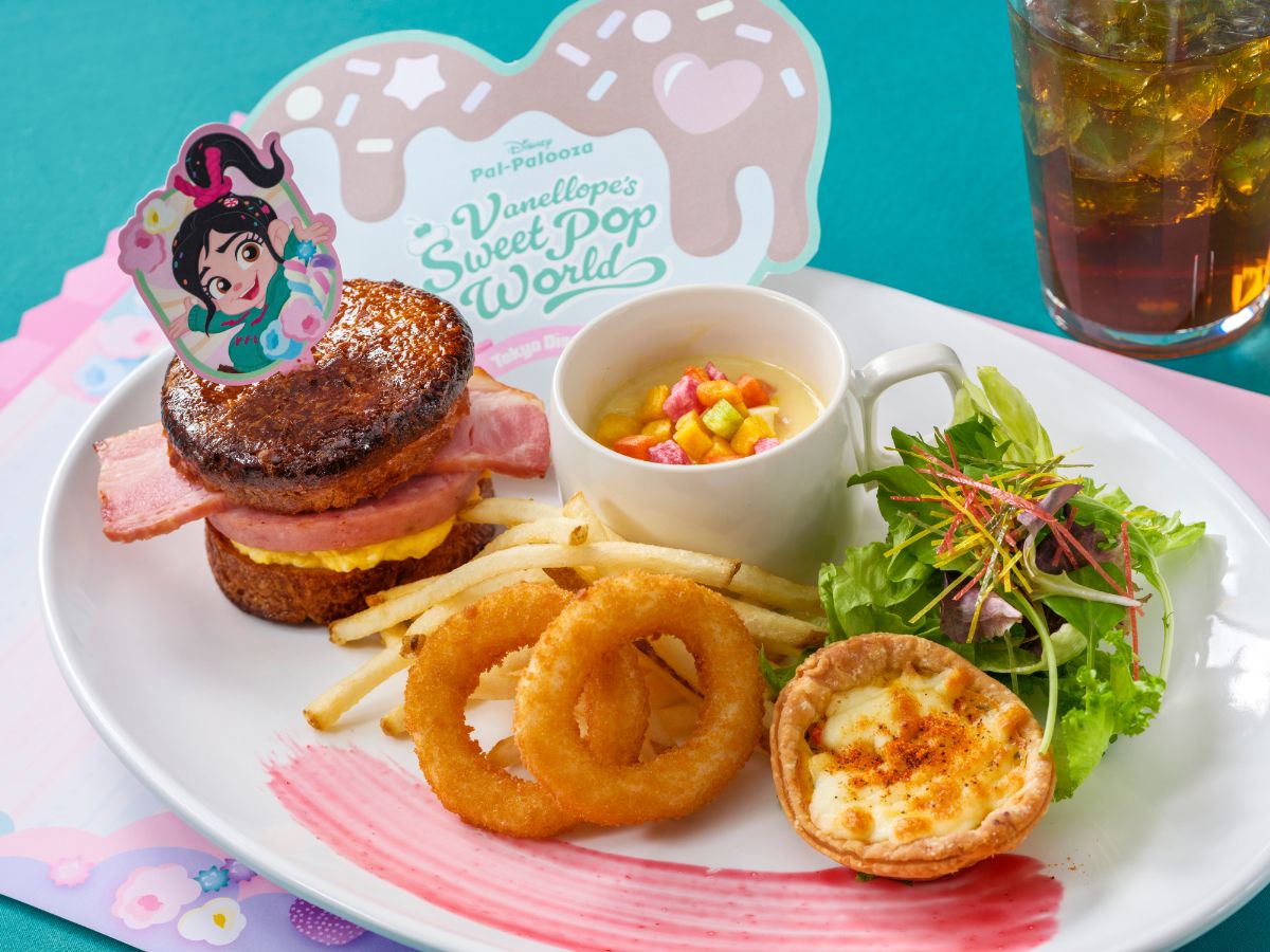 赤と白の色合いでディズニー映画『シュガー・ラッシュ』のレースコースをイメージしたホットドッグのセット。カラフルなトッピングは野菜のクルトン。エッグサラダも入って、食べ応えも抜群! フレンチフライポテトと選べるソフトドリンク付き。