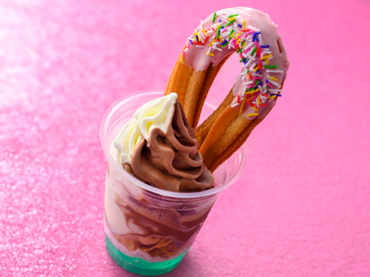 チュロスに新フレーバーが登場。カリっとした食感のクレームブリュレ風チュロスに、温かいストロベリーミルク味のフィリングが入っています。