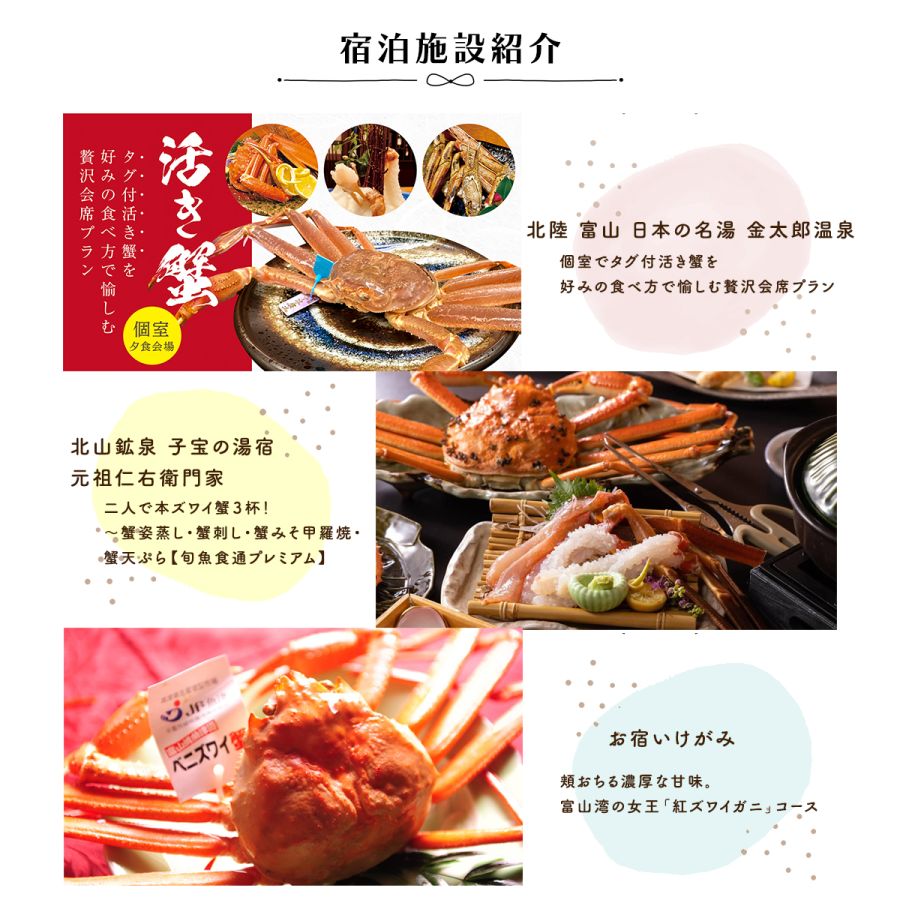せっかく魚津市を訪れるなら、カニ料理付き宿泊プランがある旅館に泊まって、のんびりするのもおすすめ。温泉に浸かって、上げ膳据え膳でカニ料理をたらふく食べて、そのままぐっすり……。しかも翌日もたっぷり観光ができ、大充実の旅が叶います。