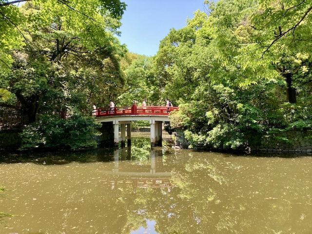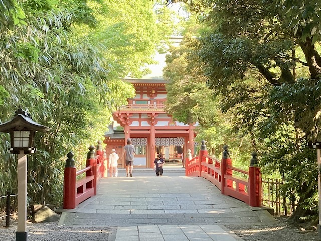 参道をそのまま直進すれば、神の池にまたがる神の橋へ。その先には、昭和15年(1940)に造営された重厚な朱塗りの楼門が立ちます。「西の賀茂(京都の上賀茂神社・下鴨神社)・東の氷川」と称えられる氷川神社のシンボル的な建物です。