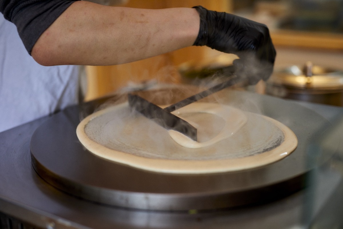 「クレープとエスプレッソと嵐山」のクレープの特徴はなんといっても生地の食感。約40㎝の焼き台にお玉になみなみ1杯分の生地を流し、トンボでくるりくるりと回しながら外周に向けて広げていきます。
