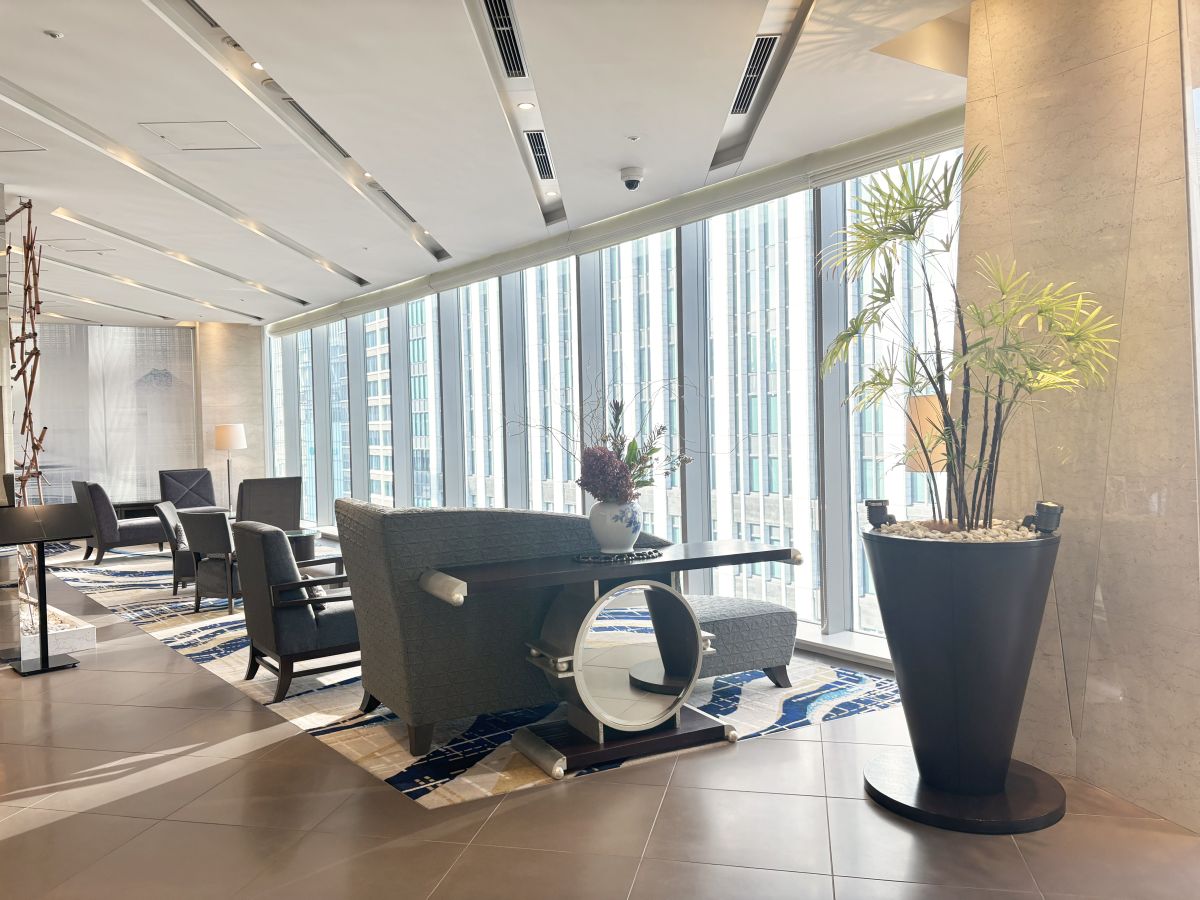 15階につくと、大きな窓のロビースペースが目に入ります。黒を基調としたスタイリッシュな空間です。