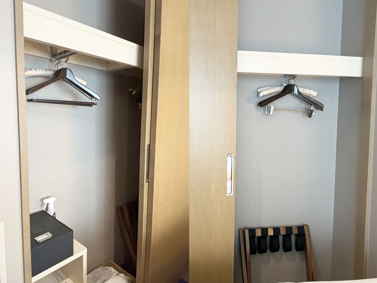 ベッド脇のワードローブにはしっかり衣服をかけるスペースがあるので、長期間の宿泊も快適。扉でしっかり区切られているのも、うれしいポイントです。