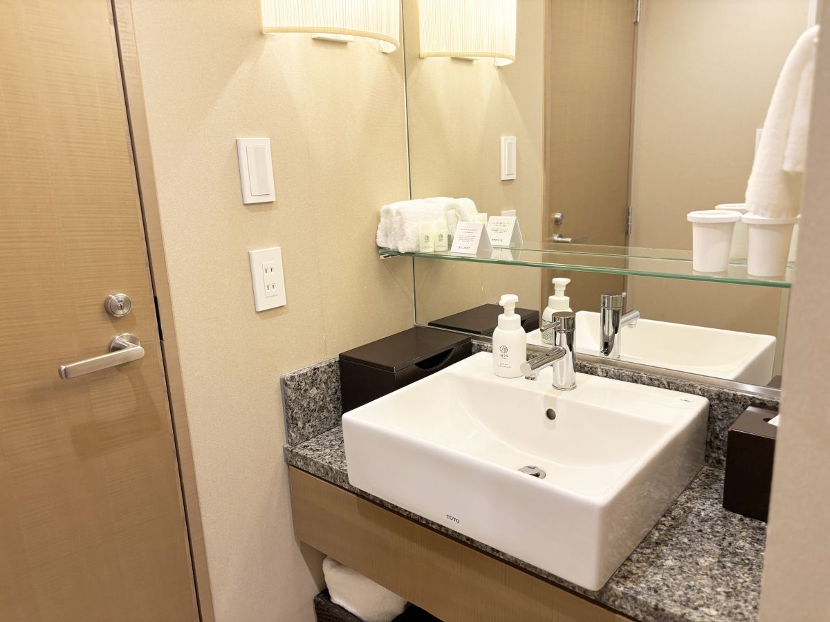 なお、「コーナーデラックスツインルーム」は、洗面所・トイレ・バスルームがそれぞれ分かれているのも特徴。清潔感のある洗面所は、大きな鏡と明るい照明で、心地よく身だしなみを整えられます。