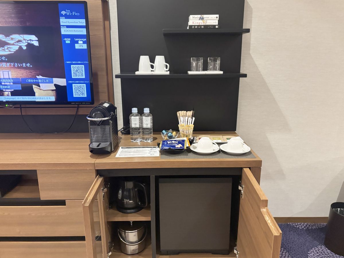 畳スペースにあるテレビ台には、食器やアメニティのドリンク、冷蔵庫、電気ポットなどが用意されています。充実した設備も「ホテル龍名館東京」のポイントです。