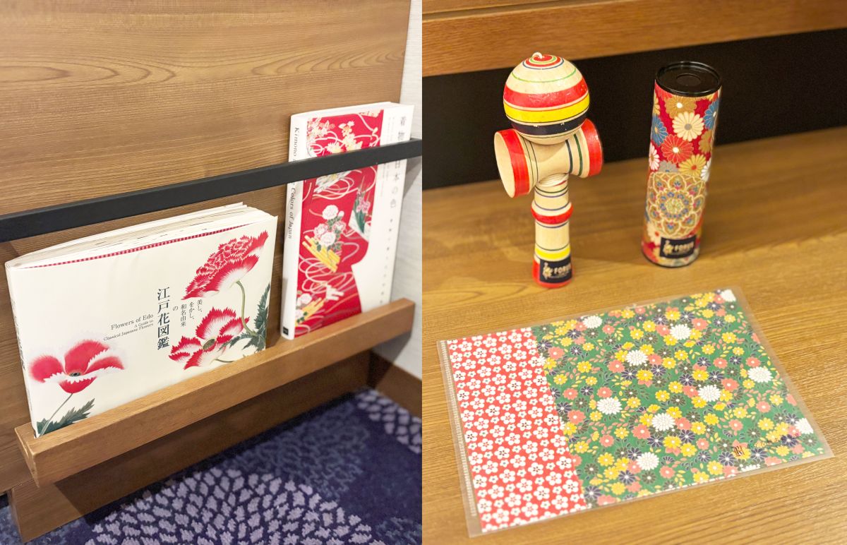 部屋でのくつろぎ時間をより豊かにするため、日本の伝統や文化にふれられるアイテムも。部屋ごとに書籍が用意されているほか、日本ならではのおもちゃであるけん玉や万華鏡、そして持ち帰り可能な折り紙が置かれています。