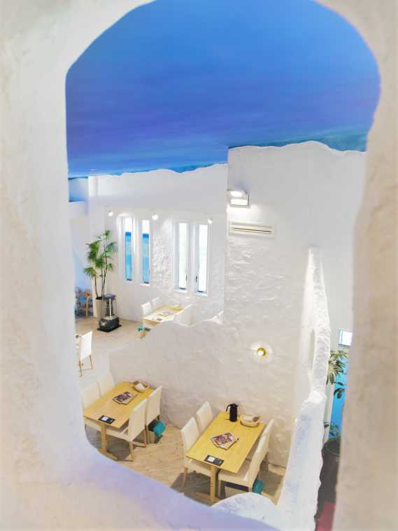 青い空に美しい白壁…。店内に入るとそこには、エーゲ海が広がっていました。ここは地中海・東北部なの?と錯覚するほど。