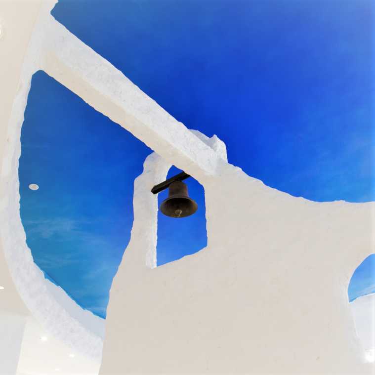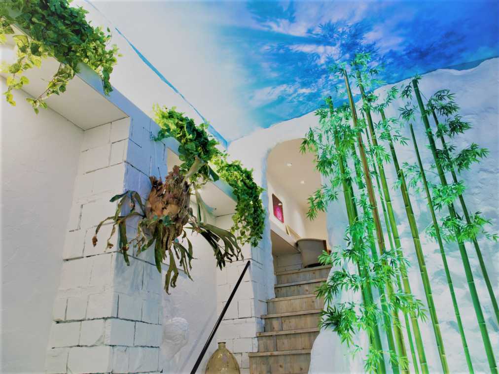 青い空へとのびる色鮮やかな竹林で和を表現。入口すぐの空間では、エーゲ海と日本の融合が楽しめます。