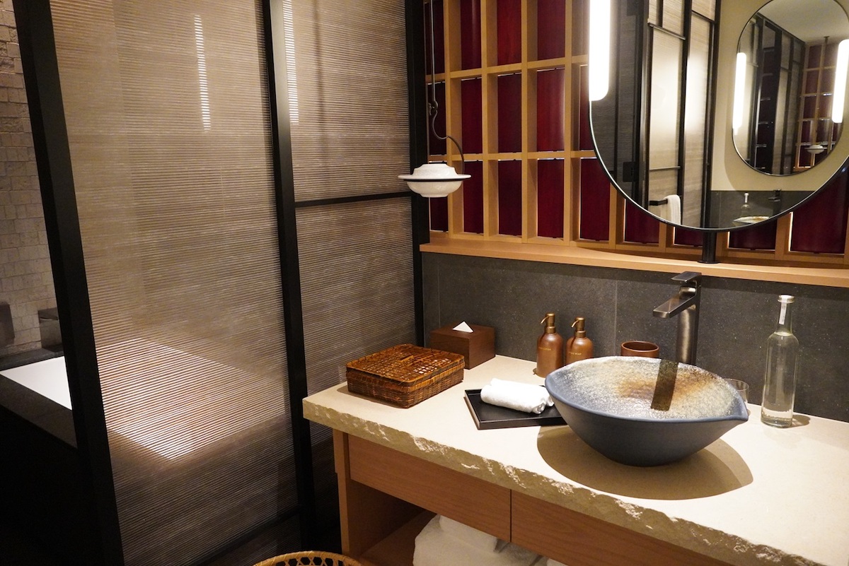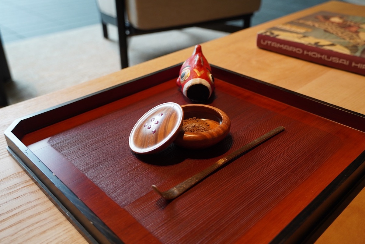 ソファに腰掛けてチェックインの手続きをする際にすすめられたのは「塗香」でした。塗香とは仏教では身を清めるとされる粉末状のお香で、手にとってすり込むように体になじませます。手のひらと手首にそっとなじませると、やわらかな香りが心を鎮めてくれました。この塗香は京都の老舗「天香堂」のオリジナルで天然香料100%と聞いて、サステナビリティの精神を感じました。
