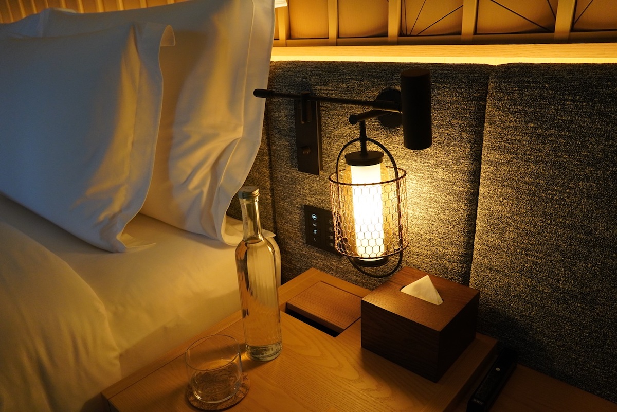 ベッドサイドの明かりは職人技が光る京都の「金網つじ」製で、まるでオブジェのよう。やわらかい光がリラックスモードに拍車をかけます。お水はペットボトルではなくビンに入っています。これはペットボトルを使わないことでプラスチックを削減することと、輸送によるCO2排出を削減するためにホテル内で詰めているもので、ビン洗浄機や充填機も完備しています。これもシックスセンシズのポリシーの具現化の一つなんですね。