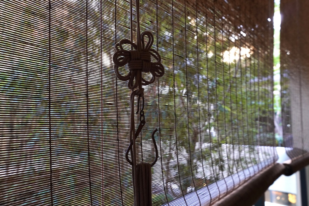 テラスの目隠しには、一般的なすだれより目の細かい御簾(みす)が設置されていました。平安絵巻を思い起こします。