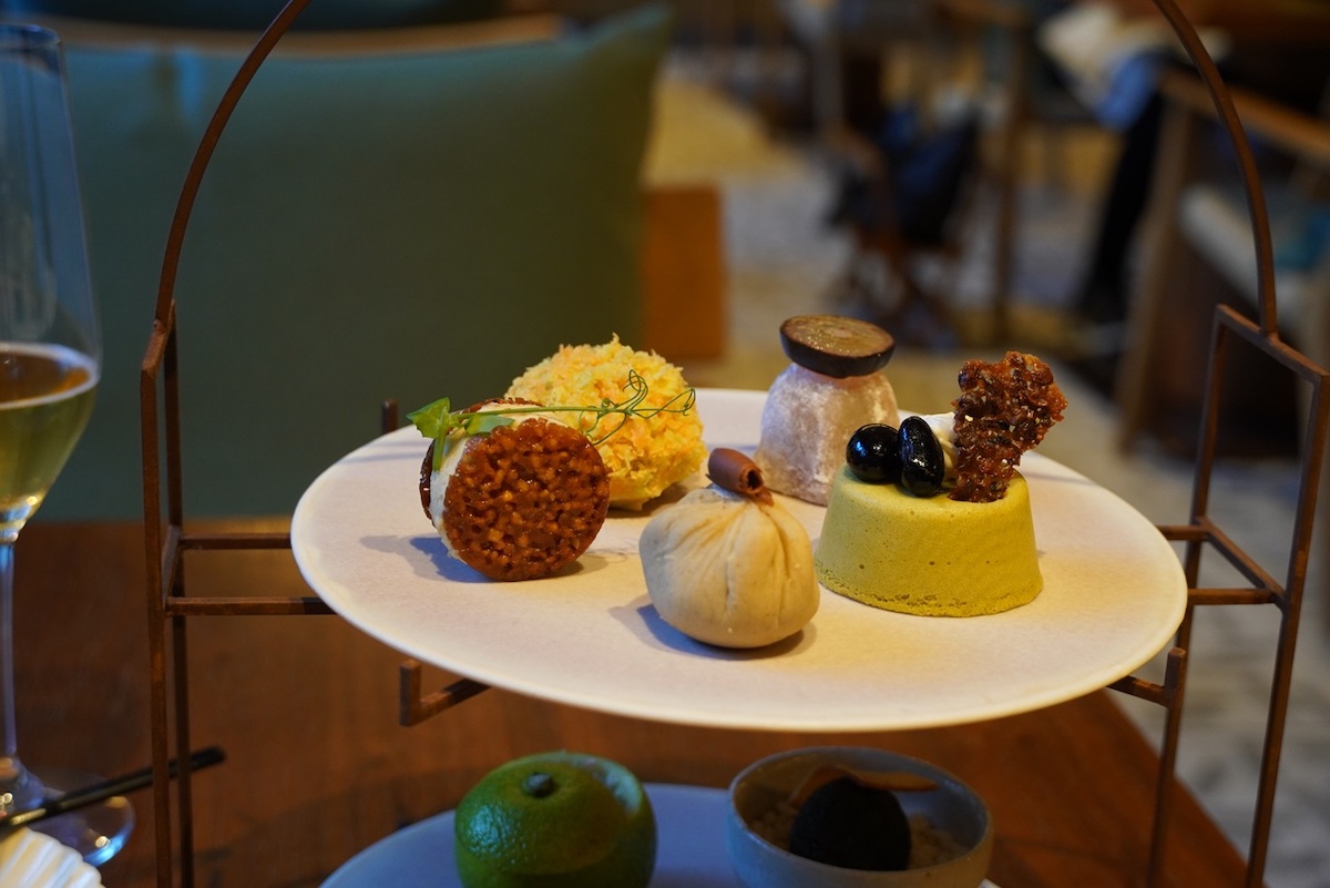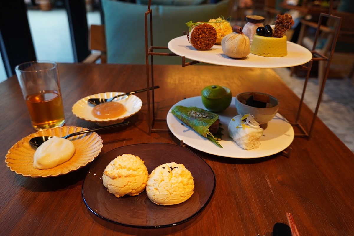 グルテンフリーに加えて、精製した砂糖を使わないシュガーフリーといううれしいアフタヌーンティーです。訪れた時は立冬のメニュー(2024年11月7日~11月21日/6900円・税サ込)でした。セイボリーは、「杉玉の酒粕リゾット」「かんぱちの蕪寿司」「かぼす窯 蟹の酢の物」「鴨のコンフィの醤油麹焼き」。「スコーン」は白みそとさつまいもの2種類に、りんごジャムと甘酒クリームでいただきます。おいしくて体にやさしいメニューです。